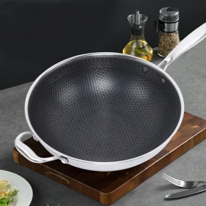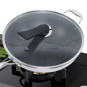 Non Stick Double Sided Screen Honeycomb Wok Stainless Steel Kitchen Frying Pan+ Lid Rapid and Even Heat Conduction for Gas Stove